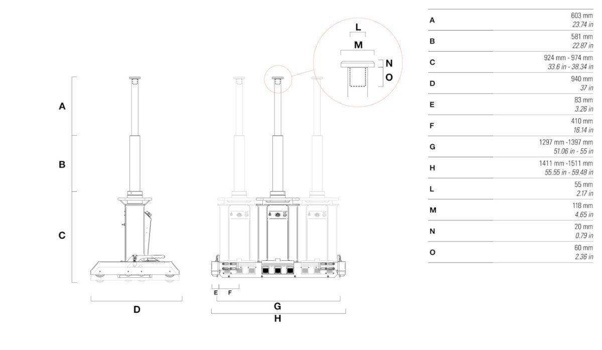 Az emelő fékekkel van felszerelve, amelyek minden irányban teljesen rögzítik, lehetővé téve a teljes biztonságot a munkavégzéshez
